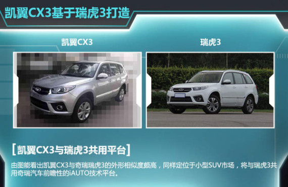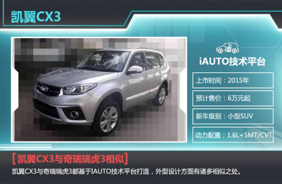 凯翼CX3与奇瑞瑞虎3都基于IAUTO技术平台打造,定位小型SUV市场,其外形与瑞虎3仅车头车尾标志处及车身细节略有不同。目前虽与瑞虎3有诸多相似之处,但作为致力于打造年轻一代喜爱的智能互联汽车的凯翼品牌,面向的消费群体更加年轻化,相信在内饰设计上与科技化配置上与瑞虎3拉开差距,将于年内上市。