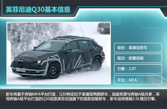 基于奔驰与英菲尼迪的合作,Q30将基于奔驰MFA平台打造,继承奔驰A级操控特性的Q30,其底盘技术也有望与奔驰A级共享。以后轮驱动为主的英菲尼迪车型中,采用奔驰A级平台基础打造的Q30极大可能是英菲尼迪旗下的首款前驱轿车,新车或将搭载2.0L增压引擎。