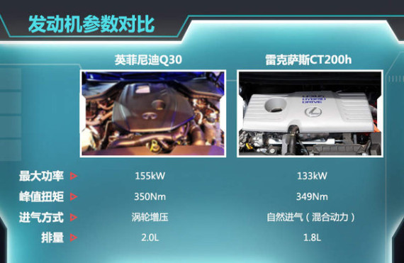 在讲究燃油经济性的今天,包括雷克萨斯在内的各大汽车厂商已向增压技术靠拢,英菲尼迪在推出2.0T的Q50后,或将该款增压引擎应用于即将发布的Q30车型,拥有155kW和350Nm的动力表现在与CT200h最大133kW和349Nm的油电综合动力表现比较时,其最大功率的优势明显,英菲尼迪Q30的上市有望抢占同为日系豪华品牌雷克萨斯CT200h的市场。