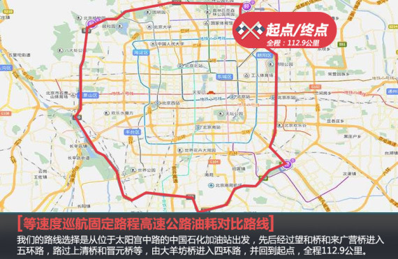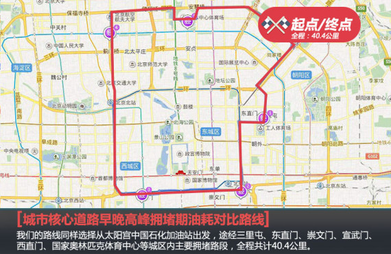 随着本次均速巡航测试的结束,时间已到下午5点10分,进入北京晚高峰的时间段,我们也将开始第二项测试,即在城市核心道路早晚高峰拥堵期油耗测试。我们的路线选择同样从太阳宫中国石化加油站出发,途经三里屯、东直门、崇文门、宣武门、西直门、国家奥林匹克体育中心等城区内主要拥堵地点,全成共计40.4公里。