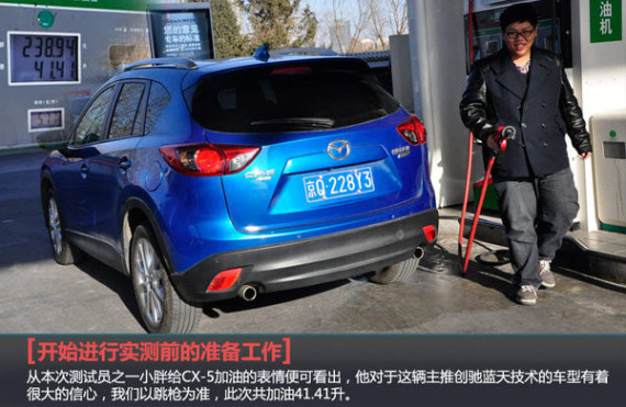 首先我们在下午两点左右开始本次油耗对比测试的第一个环节,在路况较为通常的高速路上进行等速度巡航油耗测试,我们选择了北京四环路和五环路进行测试,其实地点为位于太阳宫中路的中国石化加油站,在测试之前我们首先将车辆加满油,并以加至跳枪为准,以CX-5为例共加油41.41L,共计238.94元。并在测试结束后,再次加油至跳枪,用加油量除以行驶里程就可算出测试车辆每公里平均耗油量。而在加油过程中,从本次测试员之一小胖给CX-5加油的表情便可看出,他对于这辆主推创驰蓝天技术的车型有着很大的信心,而需加95号汽油的上海大众途观则是另一种待遇。