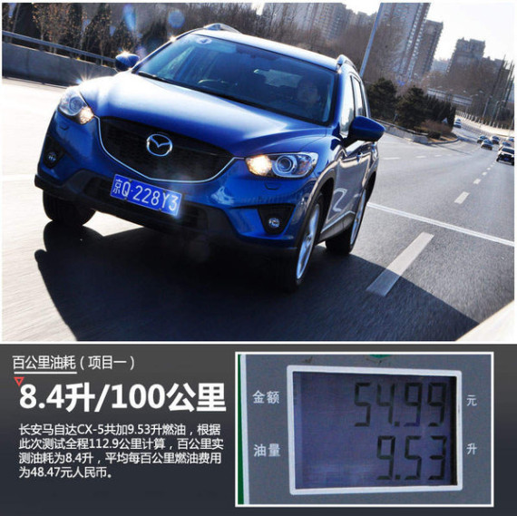 在经过约2个半小时的测试后,我们返回了太阳宫中路中石化加油站,并为测试车辆重新加满燃油。本次测试全程共112.9km,经过重新加油后,长安马自达CX-5共加9.53升燃油,百公里实测耗油约8.4升,根据目前92号汽油5.77元/升的价格,该款产品每百里燃油费为46元。而同排量的东风日产新奇骏共加10.76L燃油,百公里实测耗油约9.5升,每百公里燃油费为58元。上海大众途观作为本次测试的唯一一款涡轮增压产品,共加12.43L,以目前北京95号燃油6.15元/升的售价,该款车型百公里实测耗油约11升,每百公里燃油费为68元。