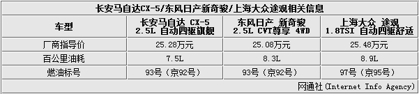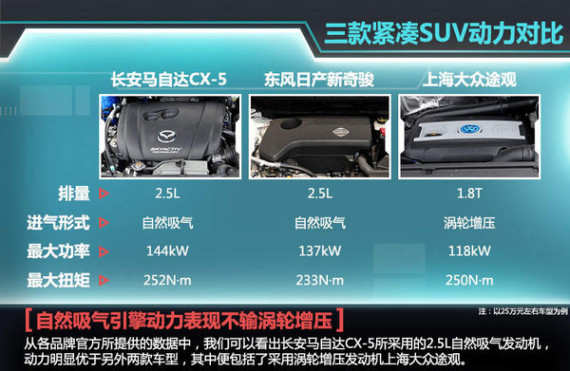 与此同时,三款产品除均有着较为出色油耗数据外,在动力参数上同样可圈可点,诸如目前上海大众途观所采用的1.8TSI涡轮增压发动机,最大功率118kW,最大扭矩250N·m,正符合目前各厂商遵循小排量增压化的趋势。不过长安马自达CX-5以及东风日产新奇骏两款日系代表虽仍为自然吸气发动机,不过相比涡轮增压引擎而言并不示弱。其中以创驰蓝天技术为主打的CX-5尤为突出,2.5L自然吸气发动机,最大功率144kW,最大扭矩则达到了252N·m。优秀的动力参数加上三款车型中最低的油耗,让其各方面均有着很大优势。