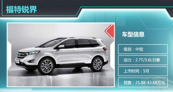 锐界是福特针对中级SUV市场推出的一款车型,2012年以进口方式引入国内销售,在进口的同级别SUV中销量排在前段班。国产锐界将搭载福特最新研发两款增压发动机。2.0L EcoBoost涡轮增压发动机,最大输出功率高达180kW。此外新车还将搭载一台2.7L EcoBoost涡轮增压发动机,最大功率为240kW,峰值扭矩508Nm。传动部分两款引擎都将匹配6速自动变速箱。而现款车型搭载3.6L自然吸气发动机则不会出现在国产锐界车型上。