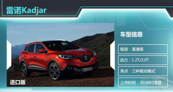 2月2日,雷诺Kadjar在欧洲进行了全球首次亮相,之后将在3月份开幕的日内瓦车展正式上市。该车是基于雷诺-日产联盟CMF-C/D平台打造的一款全新紧凑型SUV。根据东风雷诺相关规划,以kadjar为原型车的首款国产车型将于明年一季度正式上市,并将针对中国用户的习惯做出相应改变。
