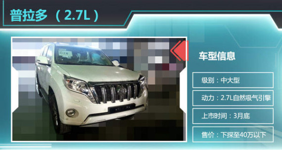 近日,网通社从相关渠道获悉,丰田今年将国产小排量的普拉多。目前搭载4.0L自然吸气引擎的普拉多已经实现国产,但成绩不甚理想。今年,搭载2.7L发动机的进口普拉多将实现国产,预计3月底上市。据悉,同步上市的还有一款3.5L排量的普拉多车型。新车推出后,普拉多的售价将进一步下探,有望吸引更多的消费者。国产普拉多2.7L将采用与进口版本相同的发动机,最大功率120kW,峰值扭矩246N·m。