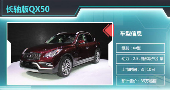 加长如今已经成为各大品牌吸引消费者的致胜法宝,英菲尼迪QX50国产后也将加长。相比进口车型,国产的QX50轴距增加80mm,离地间隙增加15mm达到165mm。新车与进口QX50基本一致,只是在个别细节之处做了一些改进。动力方面,QX50L将搭载2.5升自然吸气发动机,最大功率173kW,最大扭矩253Nm,与发动机匹配的是7速手自一体变速器。据悉,新车有后驱和四驱两个版本可供消费者选择。