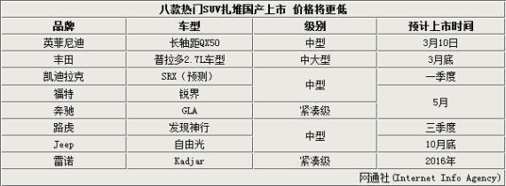 近日,被网友调侃拥有史上最长名字的路虎首款国产车——奇瑞捷豹路虎揽胜极光正式上市。随着国内市场竞争日趋白热化,各大车企纷纷加速国产以提升竞争实力,抢占市场份额。之前因为高昂的售价让人众多消费者打“退堂鼓”的进口车在国产后,售价更加实惠。那么问题来了,有哪些高端车将落户本地生产呢?近日,媒体对年内将国产的车型梳理后发现,除国产的揽胜极光外,英菲尼迪QX50等8款SUV将在陆续国产上市。这其中是否有你的菜呢?我们一起来关注一下。
