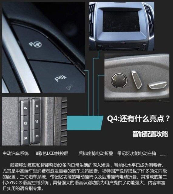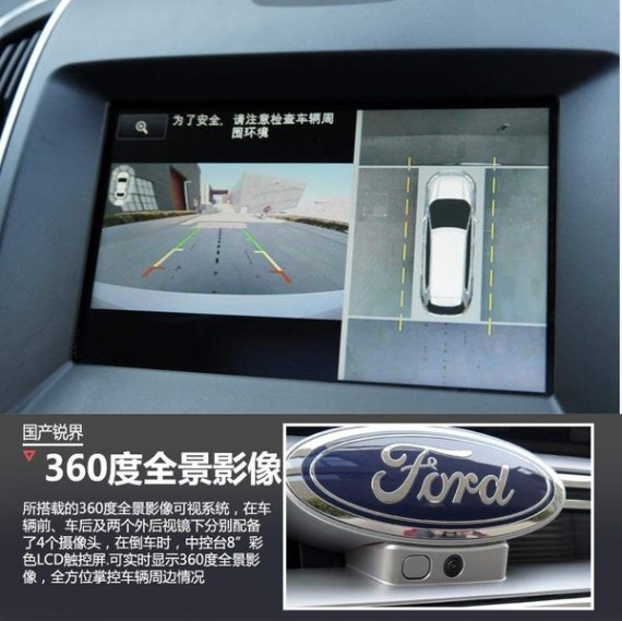全新福特锐界搭载了众多高科技配置。同级独有的“防眩目”全LED前大灯非常绚丽。有了它再也不用担心对面晃眼的远光灯了;高配版车型拥有360度全景影像可视系统,通过安装在车身前后左右的四个摄像头来获取车周围的影像,非常实用。明亮的大天窗吸睛度十足。锐界的天窗长达1.45米,宽度为0.85米,从第一排一直延伸至第三排,第三排在内的乘客在车内也能尽情享受阳光。此外,锐界还搭载有主动降噪系统(ANC)、带有泊车出库功能的主动泊车辅助系统,以及同级少有的自适应巡航系统等。