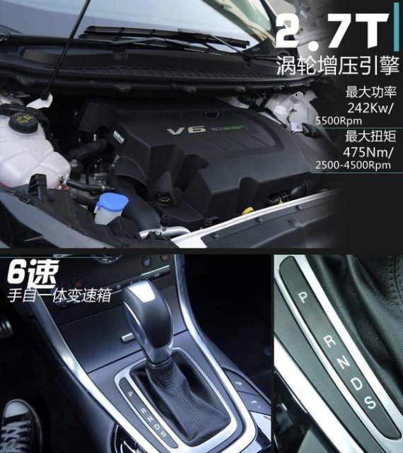 此次实拍的是锐界是搭载2.7升EcoBoost® GTDi V6汽油直喷涡轮增压引擎的车型,与之匹配的是 6速手自一体变速箱。这款发动机最大功率242kW,最大扭矩达475Nm。虽然没有试驾,但仅从数字上来看,它在路上的表现不会让人失望。除2.7T引擎外,国产锐界还将搭载一台全新升级的2.0升EcoBoost® GTDi发动机。该发动机采用最先进的双涡流涡轮增压技术,配合全新的S/S自动启停系统,更可进一步降低燃油消耗。
