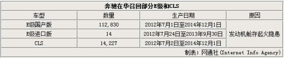 根据质检总局公布的消息,此次奔驰在华共召回3款车型,其中E级分为进口和国产版。国产版E级轿车生产日期区间为2012年7月1日至2014年12月1日,共涉及112,830辆。进口版E级为2012年7月24日至2013年9月30日期间生产,共计14辆。而CLS则是2012年7月2日至2014年12月1日期间生产,共计14,227辆受到影响。