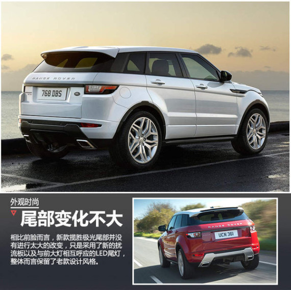外观方面,路虎新款揽胜极光前脸较现款车型做出改变,首先车辆采用最新双回字纹的设计颇具科技感,同时LED大灯在照明效果与节能方面更具优势,可以说全新的大灯让新款极光看上去更加时尚。其次,新款极光进气格栅将由经典的双杠式镀铬设计,变为类似蜂窝状的钢琴漆装饰。此外,左右两侧的进气口较老款车型变得更大,看上去将更加张扬,符合年轻人的审美观念。