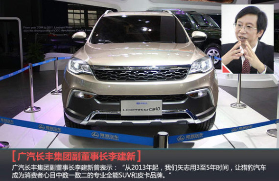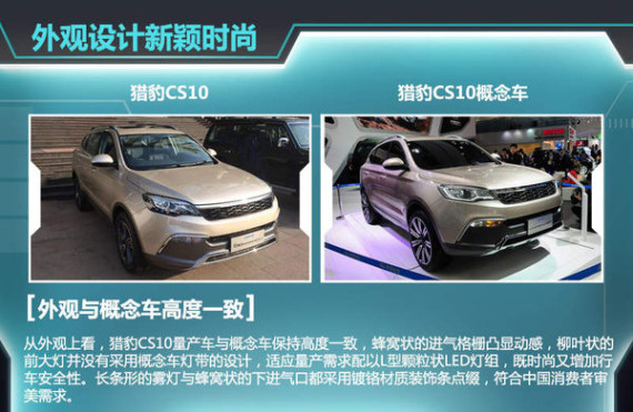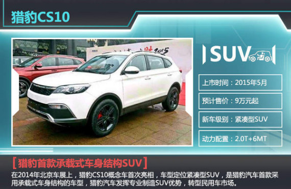 在2014年北京车展上,猎豹CS10概念车首次亮相,车型定位紧凑型SUV,是猎豹汽车首款采用承载式车身结构的车型。作为多年生产硬派越野车的汽车企业,猎豹汽车发挥专业制造SUV优势,转型民用车市场,进一步满足私人消费SUV市场需求。为此,在2015年猎豹汽车营销工作年会上,猎豹汽车宣布其走量车型“CS10”于今年5月正式上市。猎豹工厂也正在调整产能,加班加点开工,加速CS10的上市脚步。新车的推出,是猎豹汽车处于企业转型期,明确发展方向的一个开端。
