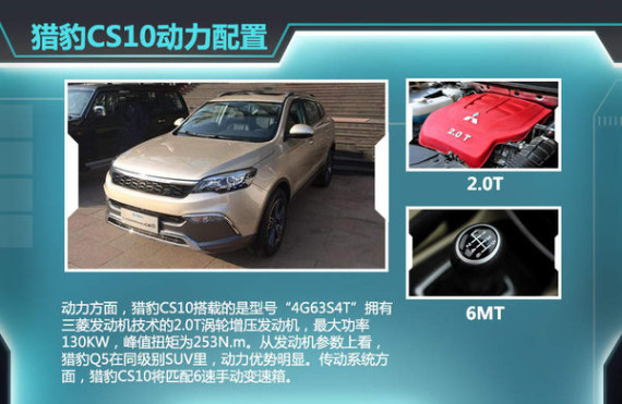 动力方面,猎豹Q5搭载的是型号“4G63S4T”拥有三菱发动机技术的2.0T涡轮增压发动机,最大功率130KW,峰值扭矩为253N.m。从发动机参数上看,猎豹Q5在同级别SUV里,动力优势明显。传动系统方面,猎豹CS10将匹配6速手动变速箱,值得一提的是,后续该车还将推出一款搭载小排量涡轮增压发动机车型,以及自动挡车型。