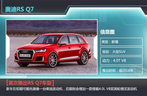 最高性能版本的Q7 RS版本在外方面与标准版区别不大,整车增加了更多的空气套件和更大的刹车和轮毂,看上去激进不少。动力方面的升级是RS版本的重点,据了解,新车在初期可能先装备一台柴油发动机,后期则会增加一款搭载4.0L V8双涡轮增压发动机,这款发动机目前也搭载在RS7上,最大功率412kw,峰值扭矩超过700N.m。