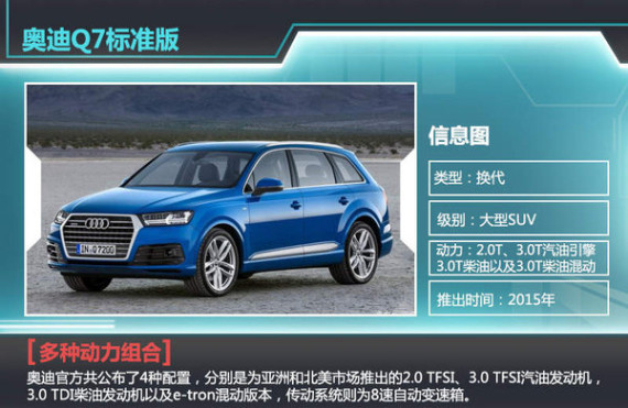 全新一代Q7采用了奥迪家族最新的造型设计理念,更多折线的应用使得新车看上去更加硬朗、更犀利。而在标准版的基础上,全新一代奥迪Q7还将推出更多衍生版本,SQ7将是性能版本,而RS Q7将是旗舰级高性能SUV,而Q7 e-tron则将进一步降低车辆的整体油耗。