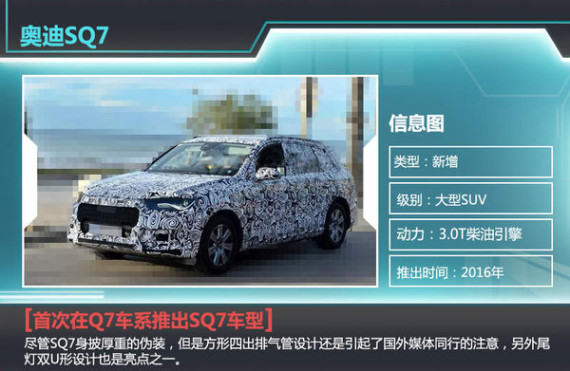 SQ7是首次出现在Q7系列车型之中,新车在外观和动力方面均有所提升。尽管SQ7身披厚重的伪装,但是方形四出排气管设计还是引起了国外媒体同行的注意,另外尾灯双U形设计也是亮点之一。动力方面,预计新车将搭载一台3.0T双涡轮增压柴油发动机,其最大输出功率在283kw,峰值扭矩750N.m。新车0-100km/h加速时间或小于4秒,百公里综合油耗或小于5.3L。值得一提的是这套动力组合式由一个电动涡轮增压器和一个废气涡轮增压器组合而成,当发动机处于低转速区间时,电动涡轮加启动工作,当废气压力足够大时,废气涡轮将会介入工作,从而保证车辆全程都可获得强劲的动力来源。