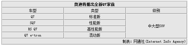 在今年年初的北美车展上,全新一代奥迪Q7正式发布。根据奥迪的战略规划,未来奥迪将在产品战略上以小型化、个性化、环保化、运动化为主要路线,更多高性能车型将推出。以即将到来的奥迪Q7为例,媒体从奥迪公布的信息中获悉,全新一代Q7家族将衍生出多款车型,这其中就包括SQ7、RS Q7这样的性能车,同时还将推出混动版的Q7 e-tron。