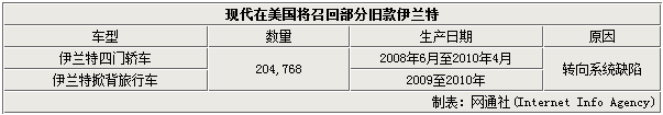根据NHTSA公布的消息,此次现代在美国召回的车型为旧款伊兰特,包括四门轿车和掀背旅行车。其中前者的生产日期范围是2008年6月1日至2010年4月30日,而掀背旅行车为2009至2010款车型,此次召回共涉及204,768辆车。现代表示,现阶段尚未收到故障引发的相关事故报告,召回将于近期启动。