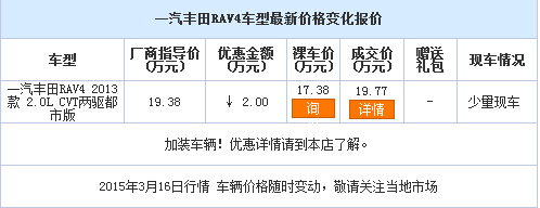 新浪银川汽车讯 近日,编辑从一汽丰田银川安利捷4S店了解到,丰田RAV4现车销售,颜色可选,目前购车部分加装车型可优惠2.00万元,感兴趣的朋友可以到店咨询或电话垂询。