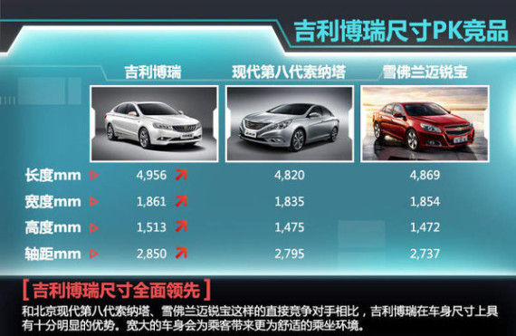 人们之所以选购一辆中型轿车,很大程度上是看重其宽大的内部空间。如果只看吉利博瑞的各项车身参数,你一定会认为这是一款更高级别的产品。的确,和北京现代第八代索纳塔、雪佛兰迈锐宝这样的直接竞争对手相比,吉利博瑞在尺寸上具有十分明显的优势。