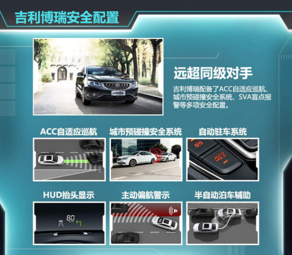 车辆安全对于车内乘员的重要性不言而喻。在这方面,吉利博瑞七位一体安全系统基本是照搬了沃尔沃的技术,包括ACC自适应巡航、城市预碰撞安全系统、SVA盲点报警等一应俱全。这些高端配置即使在价格更高的合资车型上也难觅踪影。