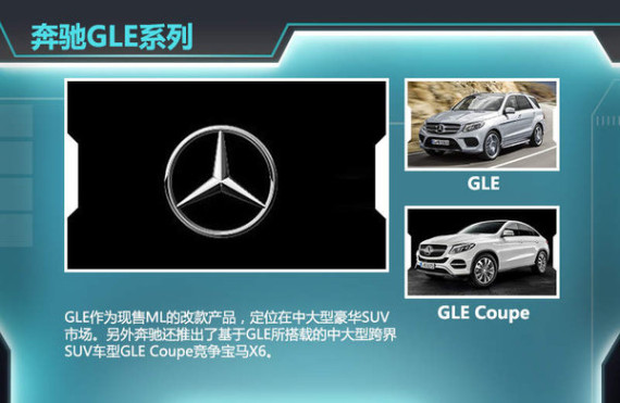GLE作为现售ML的改款产品,定位在中大型豪华SUV市场。根据全新命名体系,GL将代表SUV产品,而旗下所有车系均将由1-3个大写字母组成,并将围绕着目前轿车产品序列中的A级、B级、C级、E级和S级,在一定程度保留原始命名的同时,以字母组合的形式体现不同级别的产品,因此改名后的ML,则命名为GLE。另外奔驰还推出了基于GLE所搭载的中大型跨界SUV车型GLE Coupe,并在动力上两款新车型将搭载3.0T和4.7T两款双涡轮增压发动机外,其中前者最大功率245kW,最大扭矩480N·m;而后者上述两项参数则分别达到了了320kW以及700N·m。