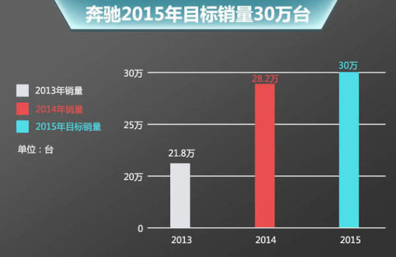 2014年,奔驰得益于全新C级和S级等新产品的推出,全年在华共销售28.2万辆新车,同比增长29%。在全球市场销量中所占比重也从14.9%提升至17.1%。而在2015年,该品牌还将推出多款新车型,从而为完成30万辆的既定目标提供有力帮助。在此次上海车展期间,奔驰GLE、GLE Coupe以及国产C级的标准轴距等5款车型将在国内正式亮相,而北京奔驰投产的国产紧凑级SUV—GLA将正式上市。