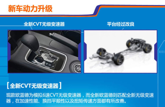 全新CVT无级变速器可提升加速性能,换挡更加并顺,并且扭矩传递也更加迅速和有效,相信新车的油耗也会随着全新CVT的加入而降低。全新欧蓝德的平台经过细致的改良,新车的震动和噪音都会得到降低,并且车身和悬架的刚度也得到加强,安全指数大幅提升。