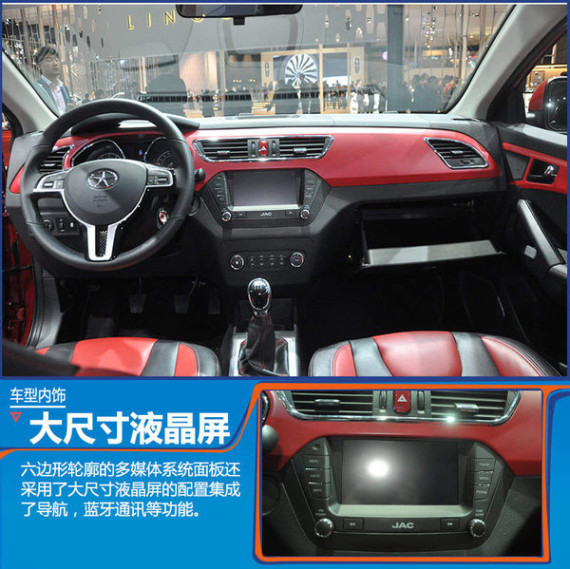 内饰部分采用了年轻时尚的红黑搭配,仪表板,车门内饰板和座椅均搭配了红色装饰。运动风格的桶型仪表盘,中控台整体较为简洁,还有空调出风口都采用了镀铬线条镶边装饰。六边形轮廓的多媒体系统面板还采用了大尺寸液晶屏的配置集成了导航,蓝牙通讯等功能。
