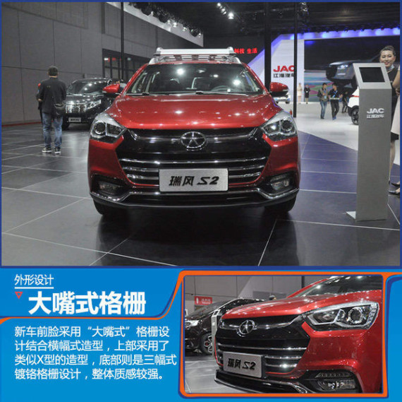 瑞风S3采用了江淮最新的设计语言,外形设计十分时尚。新车前脸采用“大嘴式”格栅设计结合横幅式格栅造型,格栅上部采用了类似X型的造型,底部则是三幅式镀铬格栅设计,整体质感较强。灯组造型设计与瑞风系列车型不同,循规蹈矩的采用偏矩形的设计,更显速度冲击感;侧面车窗的镀铬装饰条在后门位置采用了下沉式设计,同时后门拉手也采用了布置在窗框上的隐藏式设计;新车尾部线条凹凸有致,搭配分体式尾灯,彰显了整车立体感。下方还采用了黑色包围,镀铬饰条的点缀颇为精致。