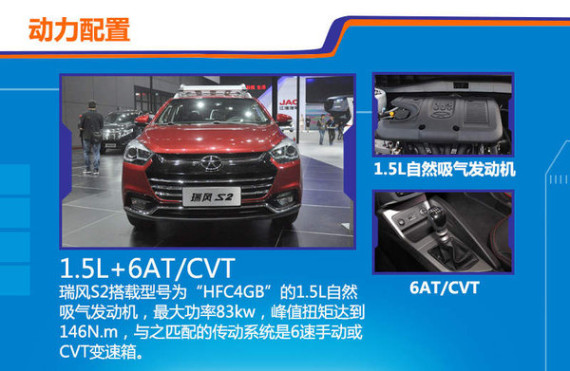 瑞风S2采用与瑞风S3相同的动力总成,但由于车身尺寸以及轻量化的车身,在新车动力上表现更好。瑞风S2搭载型号为“HFC4GB”的1.5L自然吸气发动机,最大功率83kw,峰值扭矩达到146N.m,与之匹配的传动系统是6速手动或CVT变速箱。该动力配置的优异表现已在瑞风S3上得以体现,经过众多消费者的检验,该发动机在燃油经济性、可靠性方面的表现毋庸置疑。