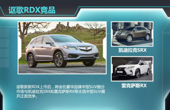 目前以凯迪拉克SRX和雷克萨斯RX等车型为代表的豪华品牌中型SUV细分市场竞争非常激烈,凯迪拉克SRX将实现国产,雷克萨斯RX换代车型也已发布,二者竞争力都得到一定程度的提升,那么讴歌RDX若想在该级别车型中突围而出,其定位将成为关键。