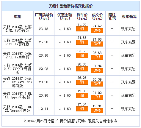 编辑点评:作为日产最新的换代车型,天籁承担着东风日产摧城拔寨的重要车型,相比上一代车型,更换了发动机的新款天籁在官方售价上有非常大的诚意,使得新款天籁的性价比很高,有兴趣的朋友可到店详谈,争取优惠。