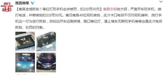 江西南昌交警在全城区域内安装了164个摄像头来抓拍开车玩手机,仅一天就拍到40多个开车玩手机的。全部处以扣2分罚款50元 的处罚。