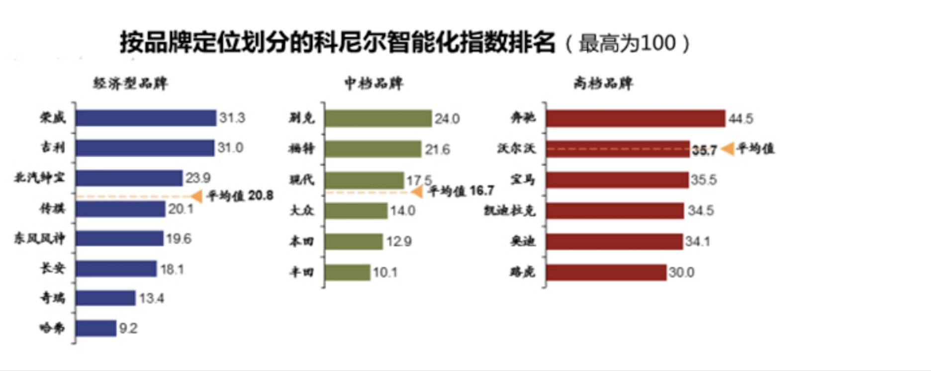 榜单中排名最高的自主品牌是荣威和吉利,分别达到了31.3和31分,已超过了路虎的分数,证明了自主品牌在智能汽车方面达到了较高的水准。汽车智能时代是汽车行业的一次革命,能看出在这一变革中自主品牌要实现弯道超车的决心。