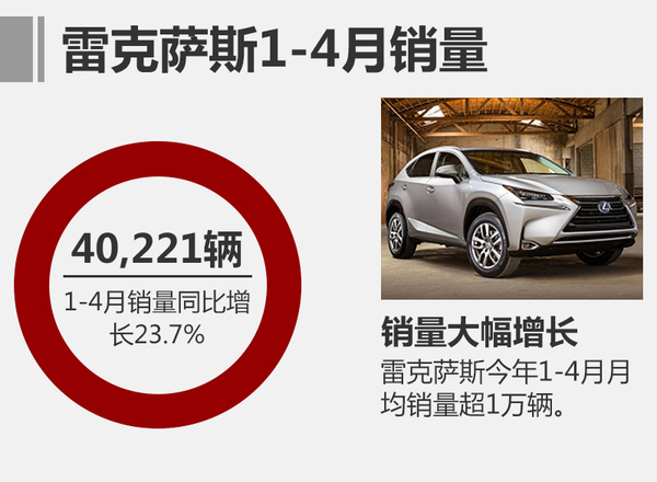 雷克萨斯4月销量再次破万,旗下三大主力车型销量稳定,ES、RX、NX的月销量分别为5,041台、2,550台、2,293台。今年1-4月,雷克萨斯在华累计销量达40,221辆,较去年同期增长23.7%。