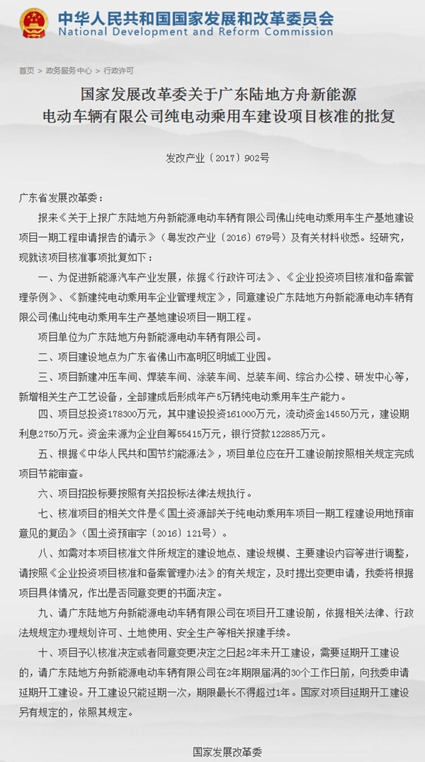 国内第14张新能源乘用车生产资质诞生,由来自广东的企业“陆地方舟”摘得。网通社从国家发改委获悉,陆地方舟拟斥资17.83亿元建设的佛山纯电动乘用车生产基地一期工程获准,该项目建成后可形成年产5万辆纯电动乘用车生产能力。