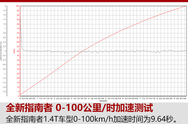经过几次实测,在0-100公里/小时加速项目上,全新指南者的最好成绩定格在9.69秒,这个加速成绩也算是预料之中,这台1.4升涡轮增压发动机加速一直都是比较舒缓,从线形图上也可以明显看到加速非常平顺。