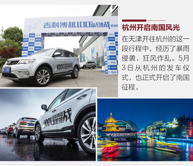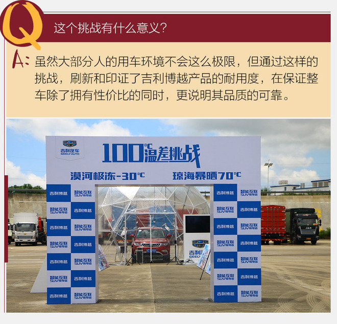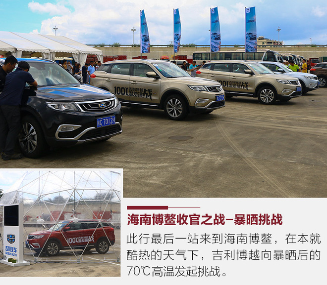 回顾整个活动,实际上这项挑战分为两段大的部分,其一就是北国风光,其二就是南国征程。从年初2月23日博越在漠河破冰而出,到5月3日从杭州出发再到今天的海南博鳌,经历了108天。这期间穿越了冰雪沙石、山地丘陵等地,而最终的海南热带试车场进行温度70℃的暴晒测试,为整个挑战100摄氏度温差的活动画上句号。