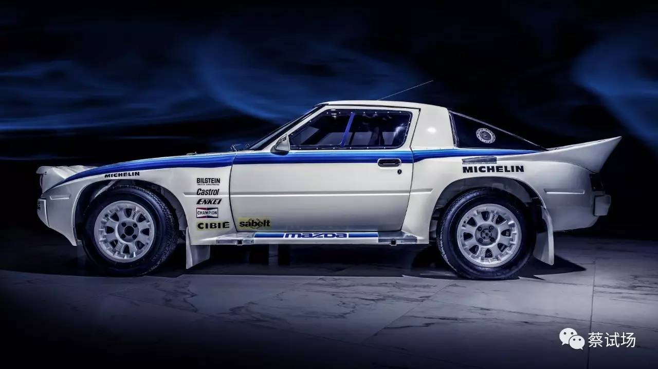 RX-7 B组赛车由马自达欧洲拉力车队打造。在B-255参赛许可下,马自达原计划生产20辆RX-7 Evolution赛车,最终为1984-1985赛季组装完成7辆,其中1辆最终撞毁,其余为零配件状态。1985年,RX-7赛车由车手Ingvar Carlosson驾驶,夺得希腊Acropolis拉力赛季军。此辆RX-7转子赛车造于1985年6月,底盘编号MRTE 019,车重不足1,000千克,13B双转子发动机输出224千瓦(304马力),后移101.6毫米以获得更好的重量分配,配Enkei轮毂和米其林TRX轮胎。MRTE 019因B组赛事取消而从未有机会参赛。1990年代初,MRTE 019与部分零配件售予马自达瑞士经销商,后被瑞士私人收藏,本世纪初售至斯堪的纳维亚,直至被现车主收藏,历经6个月翻新至出厂状态。(TG)
