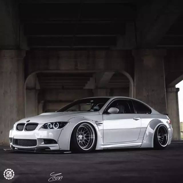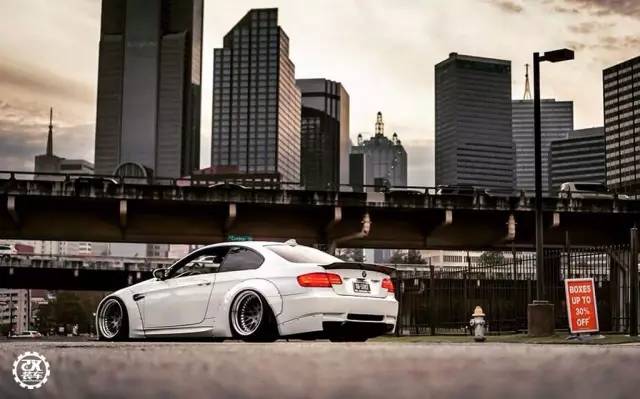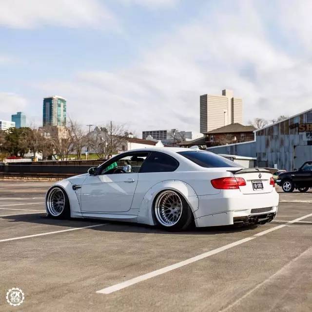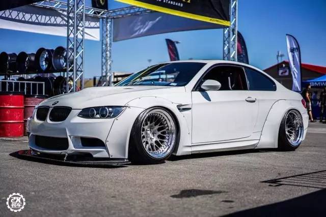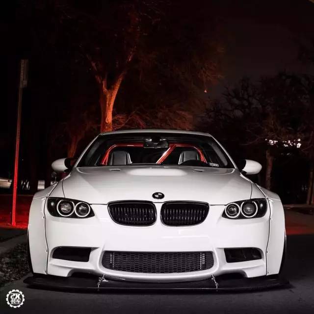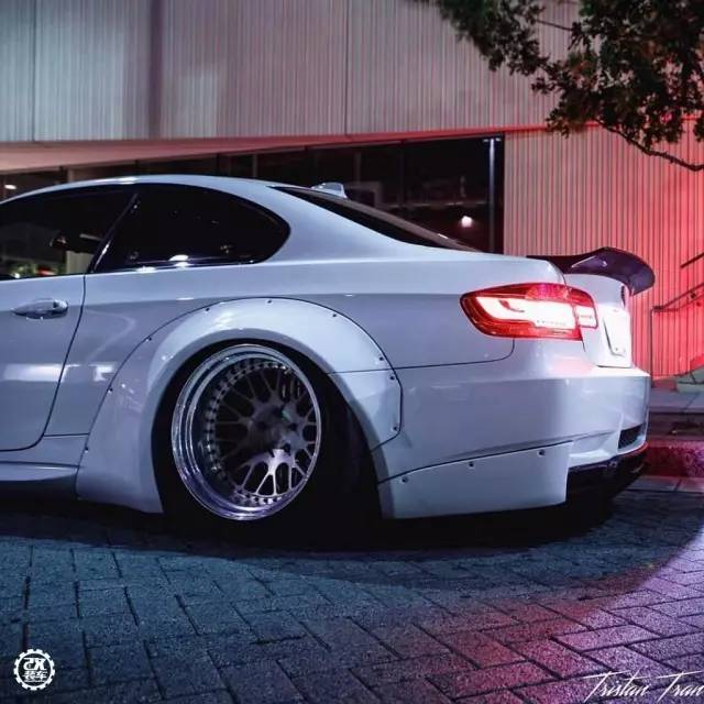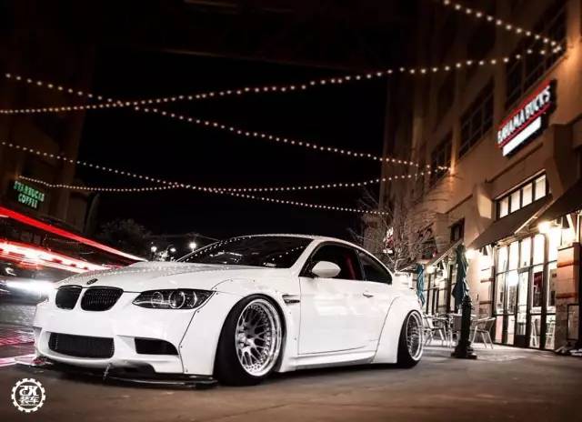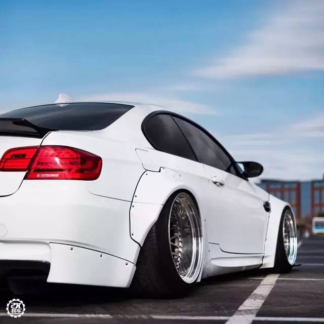 另一辆白色的M3同样改装了LB的宽体,不过相比黑色的要斯文得多,不过铆钉固定的宽体翼子板依然显得很有野性,同样的熏黑大灯在这辆白色M3身上变得炯炯有神。