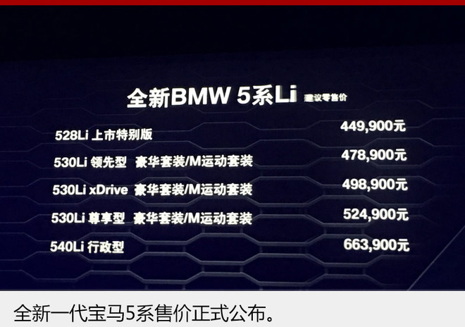 全新一代宝马5系 (配置|询价)Li是继全新1系三厢运动轿车上市后,华晨宝马又一年度重磅新车,全新的外观贴合旗舰轿车7系的设计理念。6月23日,网通社从华晨宝马官方获悉,全新一代宝马5系正式上市。新车配有多项专为中国市场打造的配置,两款全新B系列发动机分别搭载在8款车型上,售价区间为44.99-66.39万元。