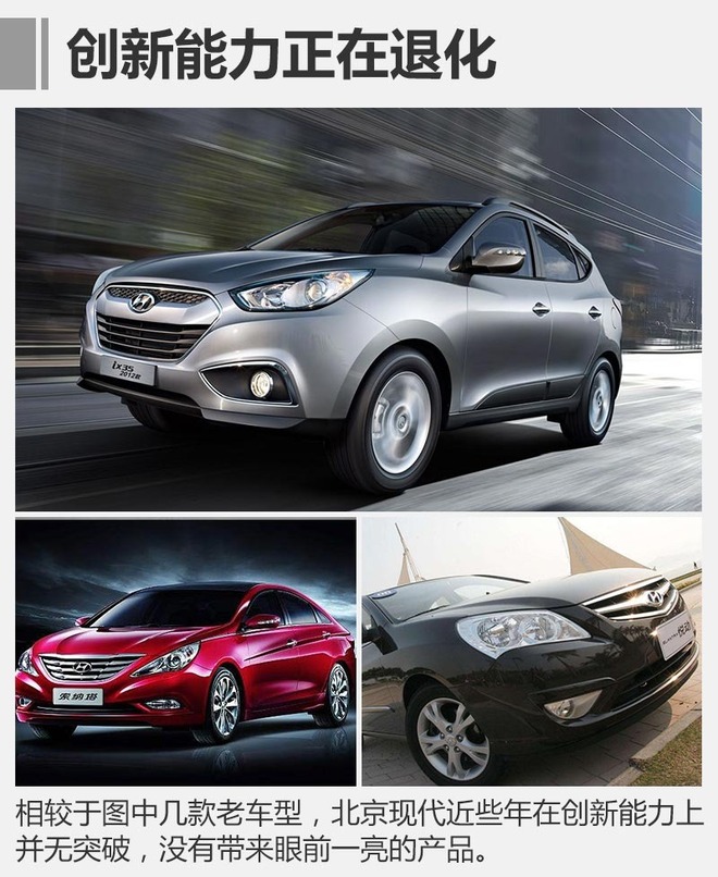 自2012年起,一直到2016年,北现虽然保持着百万辆的水平,但实际上却没有拿出符合时代要求的产品,甚至可以说,北现自身的创新能力与设计能力都在逐步“退化”。2012年前的索八和朗动,哪怕是老款悦动和ix35,推出的时候仅仅是设计风格就足以创造销量,但近几年却已经看不到北现能让消费者眼前一亮的产品。
