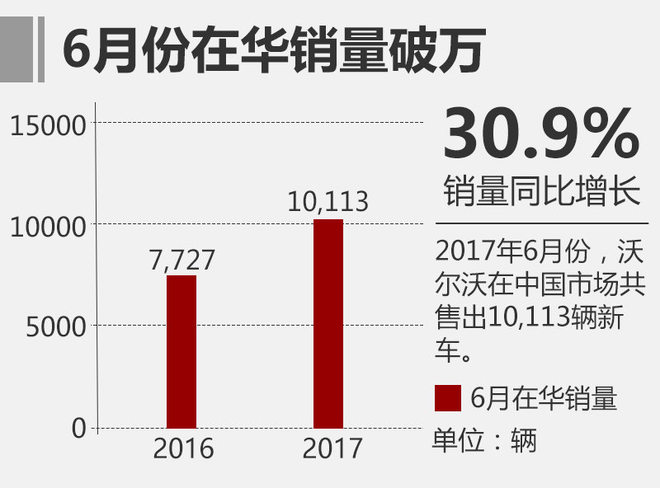 瑞典当地时间7月3日,沃尔沃汽车公布了集团在今年上半年的全球销量数据。网通社从官方了解到,沃尔沃在刚刚过去的6月份,全球范围内共售出54,351辆新车。其中,作为第二本土市场的中国实现单月销量破万,同比大幅增长30.9%,不但增速继续领跑全球各大市场,同时也是进入2017年以来连续第3个月增幅超过3成。