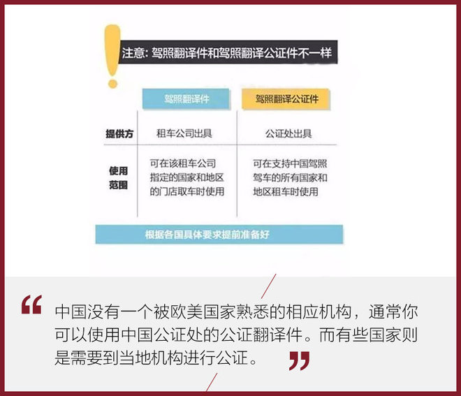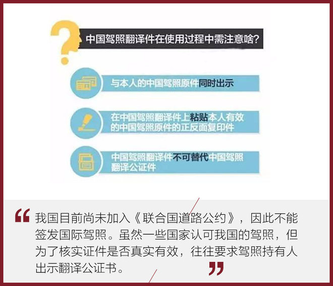 在这里需要提醒大家的是,由于外国人无法求证中国公证处的合法性,因此在承认中国驾照的国家,有些可以直接使用中国驾照,有些可以使用车行认可的翻译件,有些则需要到当地认可的翻译机构获取翻译。