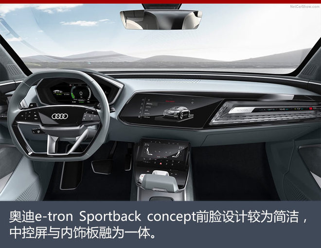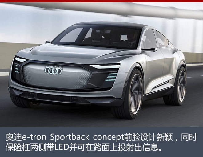 奥迪在上海车展上正式亮相的e-tron Sportback concept车型定位于轿跑SUV,该车的量产车型有望是奥迪旗下的第二款纯电动车型,并在2019年推出引入国内。新车前脸设计新颖,大灯组于黑色边框融为一体,中间留有六边形进气格栅,同时Audi标志可以点亮,突显整车科技感。