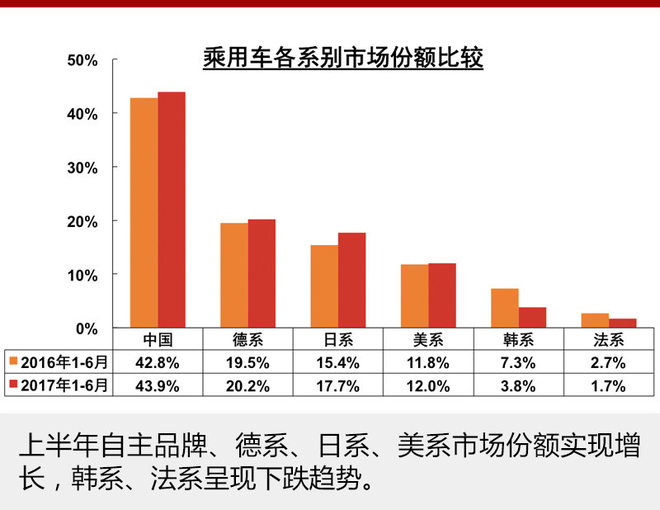 从各个车系来看,自主品牌、德系、日系以及美系实现了不同程度的增长,分别增长1.1、0.7、2.3以及0.2个百分点。韩系和法系市场份额出现明显下降,分别降低3.5和1个百分点。2017年,自主品牌每个月市场份额都相比上一年有所增长,其中2月份市场份额达到有史以来最高点48.2%,3月份最高达到2.3个百分点的增长。