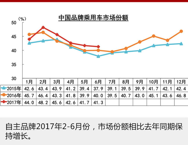 2017年上半年,在乘用车市场整体出现波动的情况下,自主品牌延续了去年的增长。网通社从汽车工业协会获悉,2017年1-6月,乘用车产销分别完成1148.3万辆和1125.3万辆,比上年同期分别增长3.2%和1.6%,低于汽车总体1.4和2.2个百分点。在市场份额方面,自主品牌市场份额逐月实现增长,总体由去年同期的42.8%增至43.9%,并且在轿车以及SUV领域份额均实现了增长。相比2014年下半年跌破20%的市场份额,自主品牌占比实现了翻倍增长。