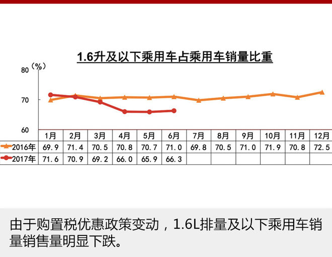 从整个大环境下,乘用车市场有所下滑,与购置税优惠政策调整有着重要关系。数据显示,1.6L及以下乘用车销售121.4万辆,比上年同期下降4.4%,占乘用车销量比重为66.3%,比上年同期下降4.7个百分点。1-6月,1.6升及以下乘用车销售769.7万辆,比上年同期下降2.6%;占乘用车销量比重为68.4%,比上年同期下降3.0个百分点。